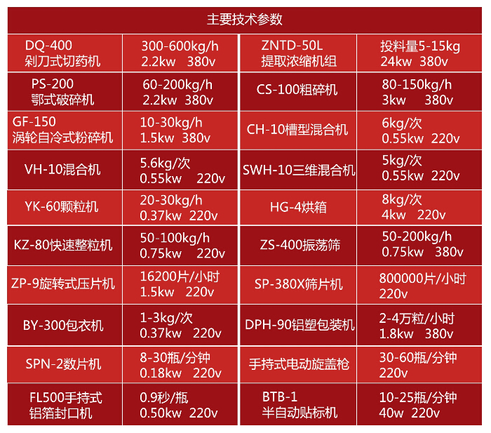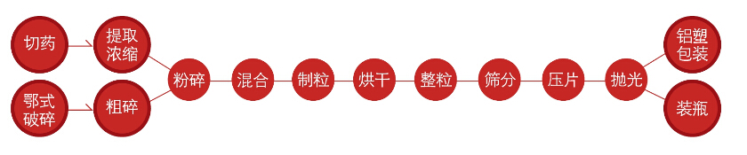 Ê×ÏÈÓÃÇÐÒ©»ú½«ÎïÁÏÇÐ³ÉÆ¬»ò¶Î£¬È»ºóʹÓÃÌáȡŨËõ»ú×éµÃµ½Å¨ËõÎÎïÁÏÒ²¿ÉÒÔÊ×ÏȾ¹ýPS¶õÊ½ÆÆËé»ú½øÐÐÆÆËéºó£¬ÔÙÓÃCS100´ÖËé»ú£¬½«´ó¿éÎïÁÏ´ÖË飬Ȼºó½øÐзÛË飻·ÛËé»ú¿ÉÑ¡ÔñGF-150ÎÐÂÖ×ÔÀäʽ·ÛËé»ú»òSF-130ÖÐÒ©¸ßËÙ·ÛËé»ú£¬ÎïÁÏϸ¶È100-120Ŀ֮¼ä¡£·ÛËéºó£¬½«¶àÖÖÎïÁϵ¹ÈëCH-10»ìºÏ»úÄÚ£¬»ìºÏ¾ùÔÈ¡£CH-10»ìºÏ»úÊʺϸɷۺÍʪ·Û»ìºÏ£¬°´¹¤ÒÕÒªÇó£¬Ê¹ÓÃVH-10»òSWH-10»ìºÏ»ú½øÐÐ×ܻ졣YK-60¿ÅÁ£»ú°Ñ×Ü»ìºóµÄÎïÁÏÖÆ³É11Ä¿¡ª14Ä¿µÄ¿ÅÁ£¡£È»ºó²ÉÓÃHG-4»òHG-6ºæÏ䣬°ÑÎïÁϺæ¸É¡£ºæ¸ÉºóÓÐЩÎïÁÏ»á½á¿é£¬Ê¹ÓÃKZ-80¿ìËÙÕûÁ£»ú½«ÎïÁÏ¿ìËÙ»¹Ô³É¿ÅÁ££¬¶ø²»ÆÆ»µÆä¿ÅÁ£ÐÎ̬¡£ZS-400Õñµ´É¸½«²»Í¬Ä¿ÊýµÄ¿ÅÁ£ºÍ·Ûĩɸ·Ö£¬±£Ö¤Ñ¹Æ¬ÎïÁÏÖÊÁ¿¡£Ñ¹Æ¬»ú¿ÉÑ¡ÔñZP-9ÐýתʽѹƬ»ú»òTDPµ¥³åѹƬ»úϵÁС£Ñ¹Æ¬Ê±£¬×îºÃ½«ÎïÁÏÅä±È£¬11Ä¿¡ª14Ä¿µÄ¿ÅÁ£Õ¼30%£¬60Ä¿-80Ä¿·Ûĩռ70%£¬Èç´ËÅä±È£¬ÎïÁÏÁ÷¶¯ÐԺã¬Ñ¹ÖƳÉÐÎµÄÆ¬ÖØÒ»Ö¡£Æ¬¼ÁÑ¹ÖÆ³öÀ´ºó£¬ÓÃSP-380XɸƬ»úÅ׹⣬ȥ³ýë´ÌºÍ·Û³¾¡£Ö®ºó£¬¿ÉÑ¡ÔñBY-300ÌÇÒ»ú°üÌÇÒ»ò°ü±¡Ä¤Ò¡£